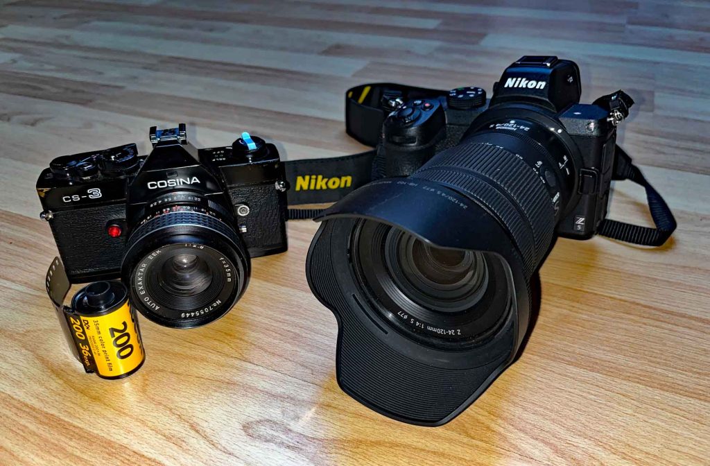 Das Projekt beginnt mit einem Farb-Negativ Film, Kodak, 200 ASA, 36 Aufnahmen. Entsprechend stelle ich das Zoom an der Nikon ebenfalls auf 35 mm und die ISO-Zahl an der Kamera fix auf 200 ASA. Das gleiche Motiv fotografiere ich erst digital, dann analog. Bis der Film voll ist, gibt’s hier erst mal nicht zu sehen. Aber: stay tuned! … Ich bin selber neugierig